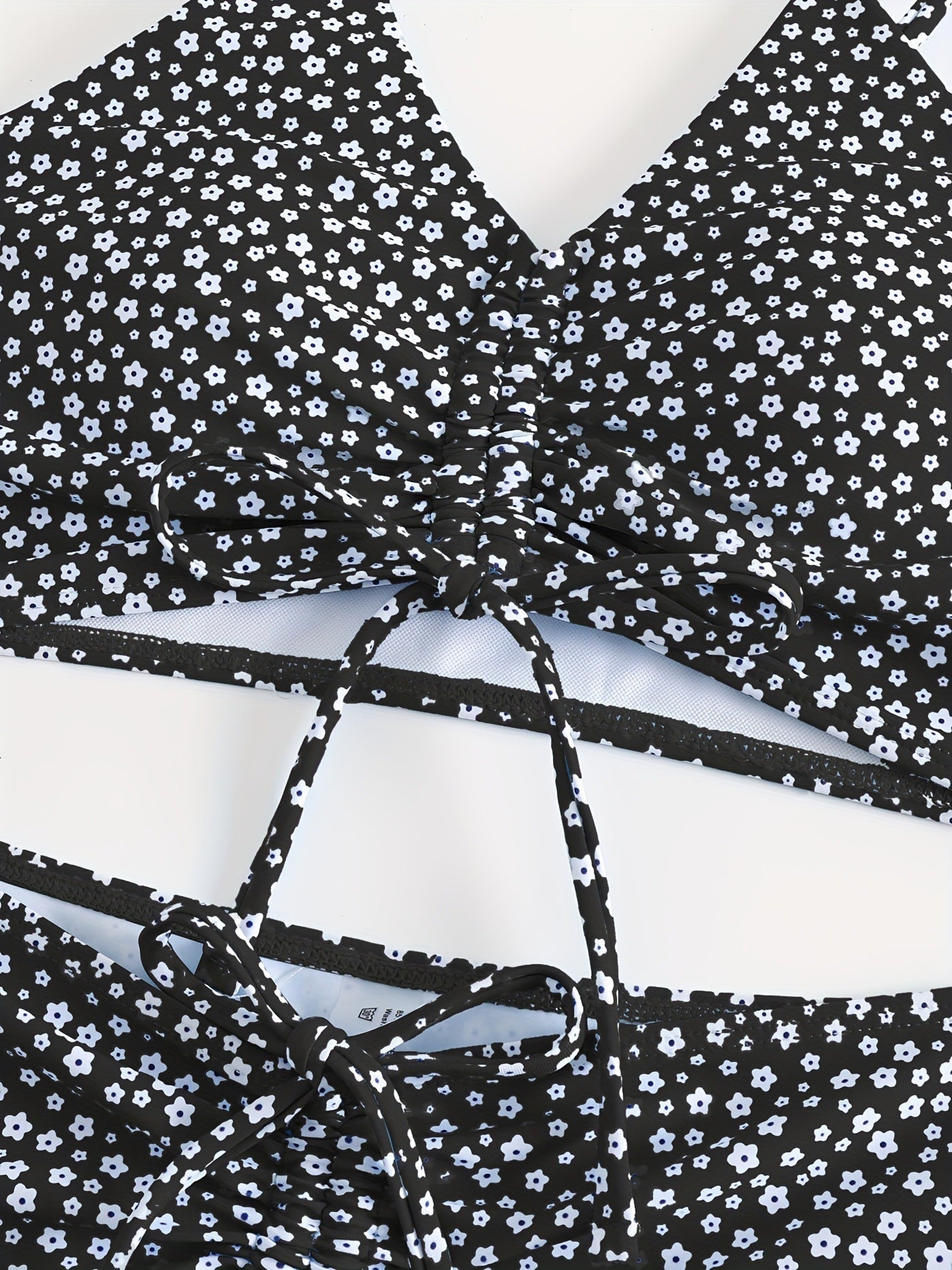 Black Solid Color Bikini Set with Floral Boyshorts – Two-Piece Swimsuit for Women
