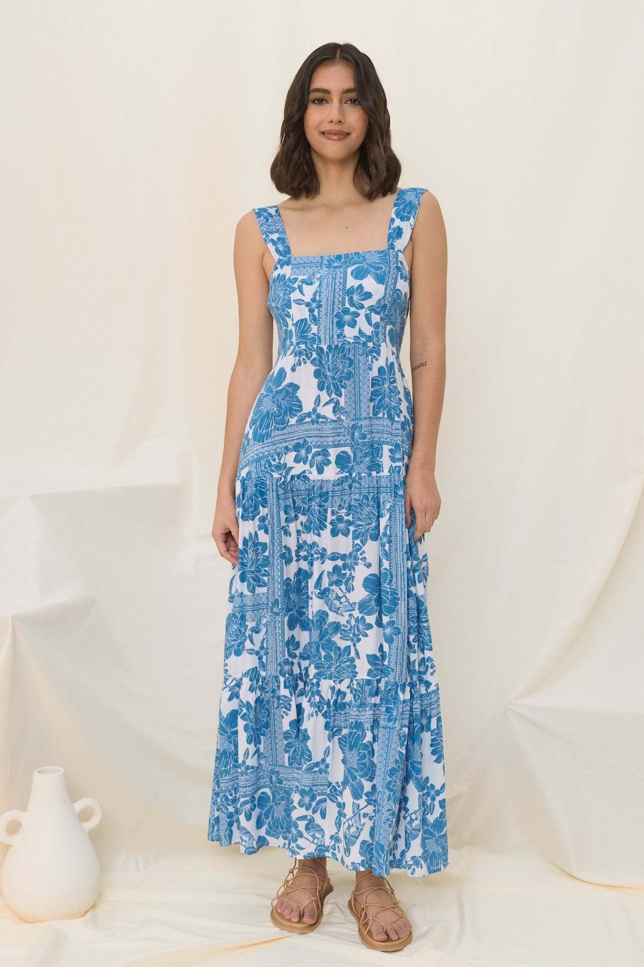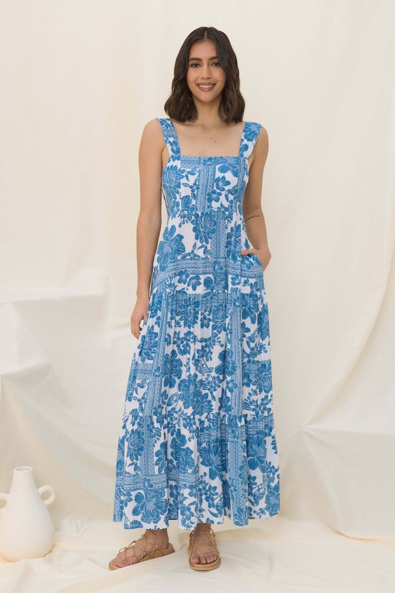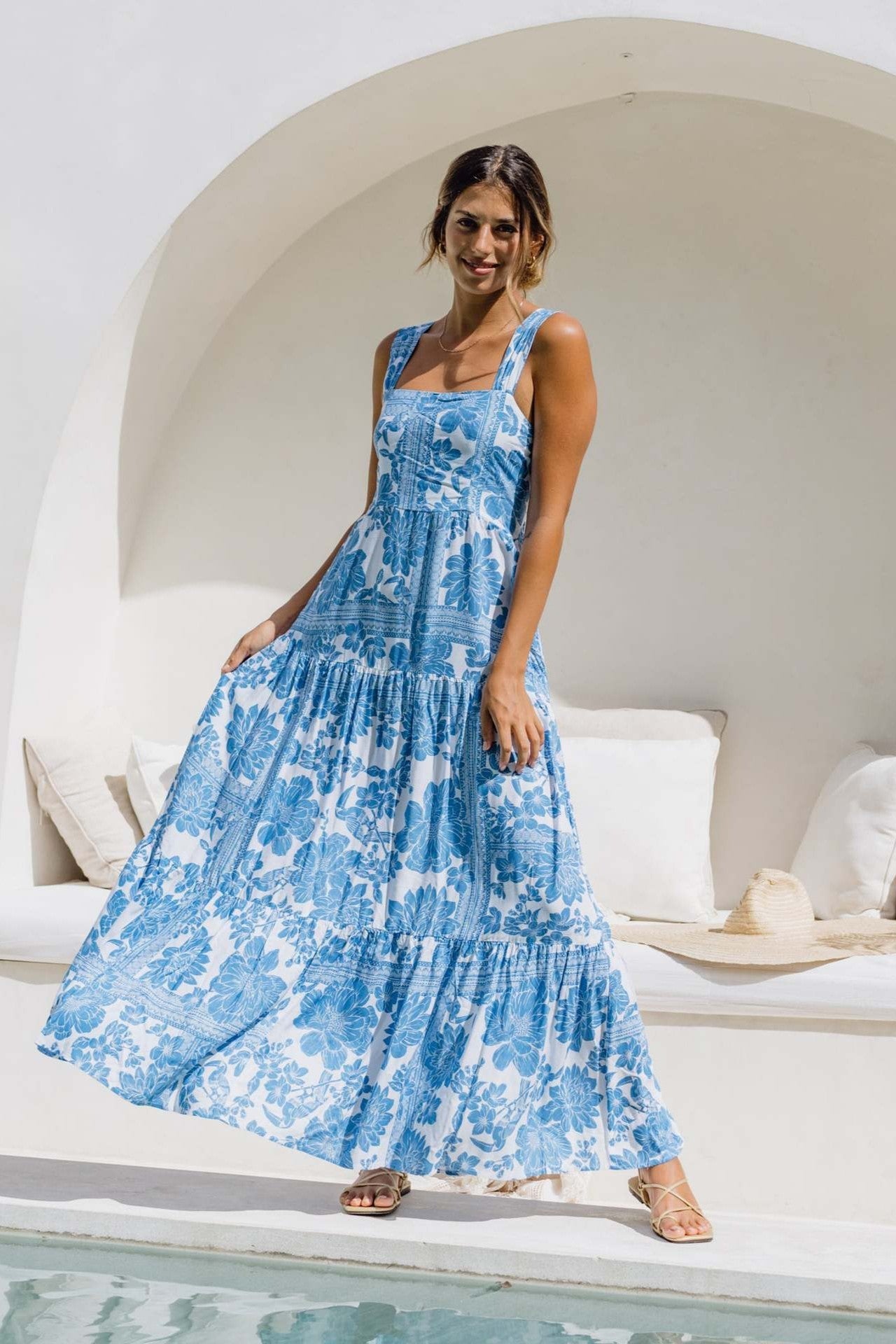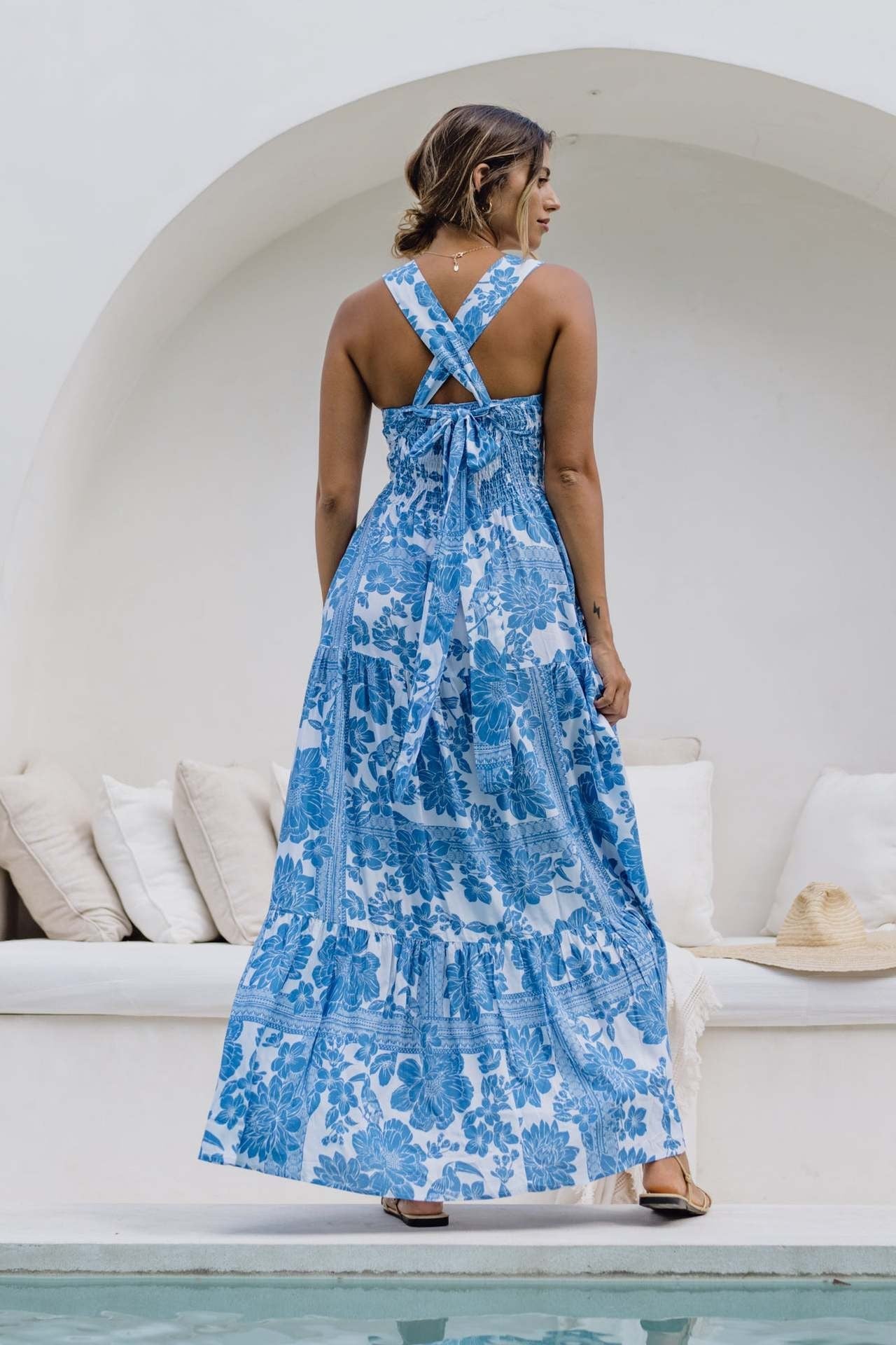 New High-End Beach Floral Print Long Camisole Dress Blue