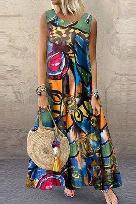 Oversized Round-Neck Sleeveless Maxi Dress with Print Green